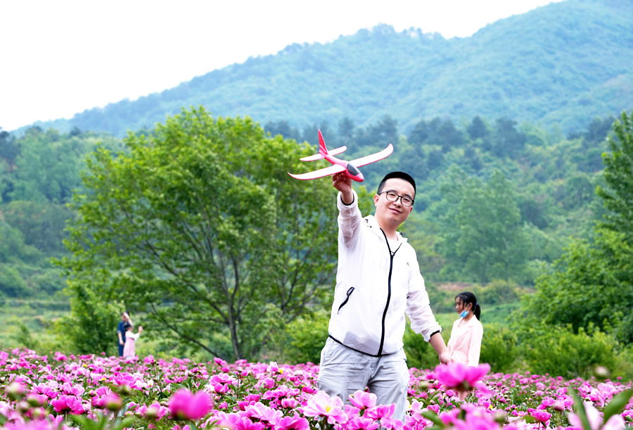游客在新县苏河镇朱店村芍药园观赏