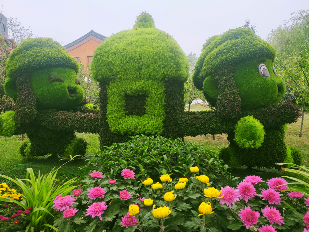 在南门处设置《曲径通幽》小品景观,给人一种神秘而又惊喜的感觉,不由自主地走进去,别有洞天;在丹台宫西门道路一侧,设置花镜互动,达到“人在花中过,花在身上留”的效果;在中国馆外,设置《战疫斗士》场景,以许愿树为背景,希望家国平安,生活美好,前景是与病毒战斗的清明娃,花坛中的粉色树位置为“吊打新冠病毒”。