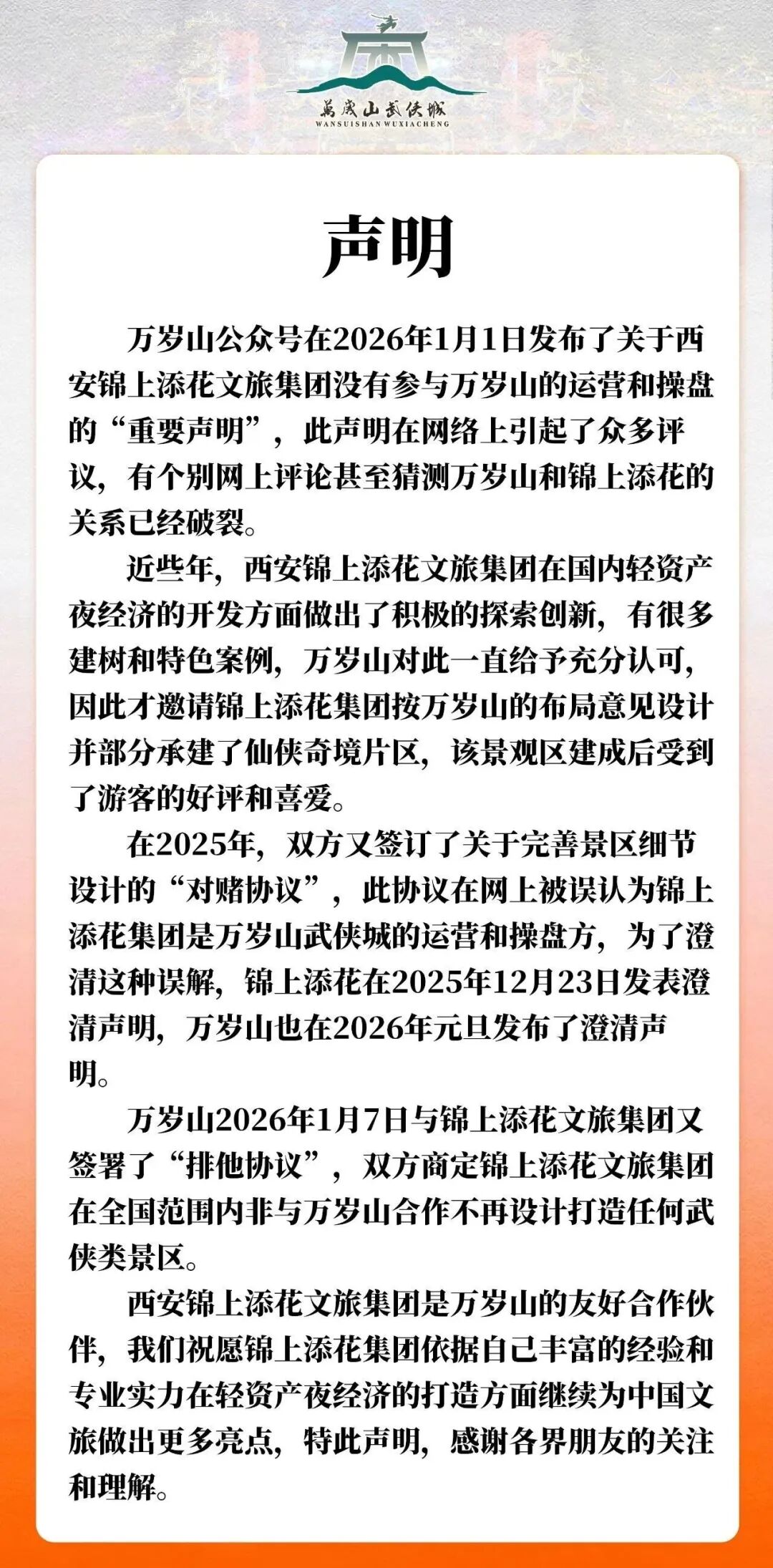 此前,1月1日,万岁山武侠城发布了关于西安锦上添花文旅集团没有参与万岁山的运营和操盘的“重要声明”,此声明在网络上引起了众多评议,有个别网上评论甚至猜测万岁山和锦上添花的关系已经破裂。当时的声明表示,万岁山武侠城经营管理一直以来都由自身团队主持和主导,从未委托给任何第三方机构来运营或操盘。